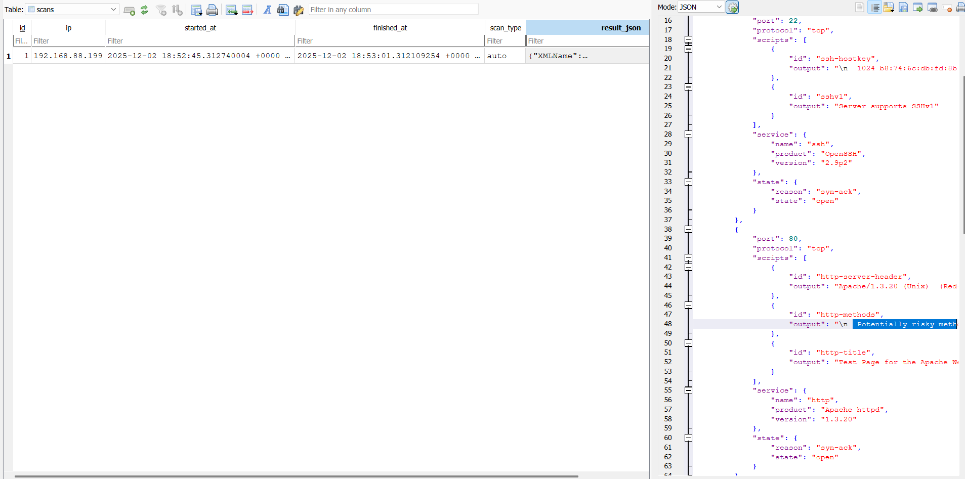 The system generates self-contained HTML reports scheduled daily at configurable time (default: 23:59) covering the last 24 hours. Reports include summary mode (host list with scan timestamps and open port counts) and detailed mode (additionally includes top-N open ports statistics across all scans). Sensitive script detection automatically flags scans containing NSE scripts that reveal potentially exploitable information (e.g., ssh-hostkey, ssl-cert, smb-os-discovery, ftp-anon). Reports are saved to /data/reports/ and optionally delivered via SMTP. All scan results are stored in embedded SQLite (WAL mode) with endpoints, scans, and ports tables. Full Nmap XML results are stored as JSON for deep analysis and forensics.
