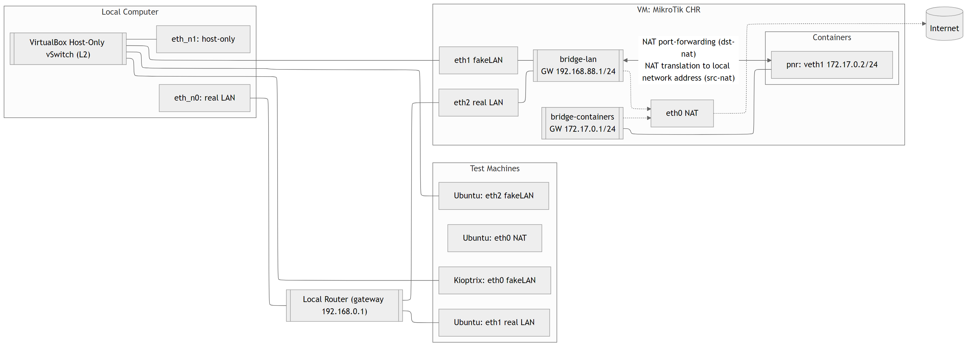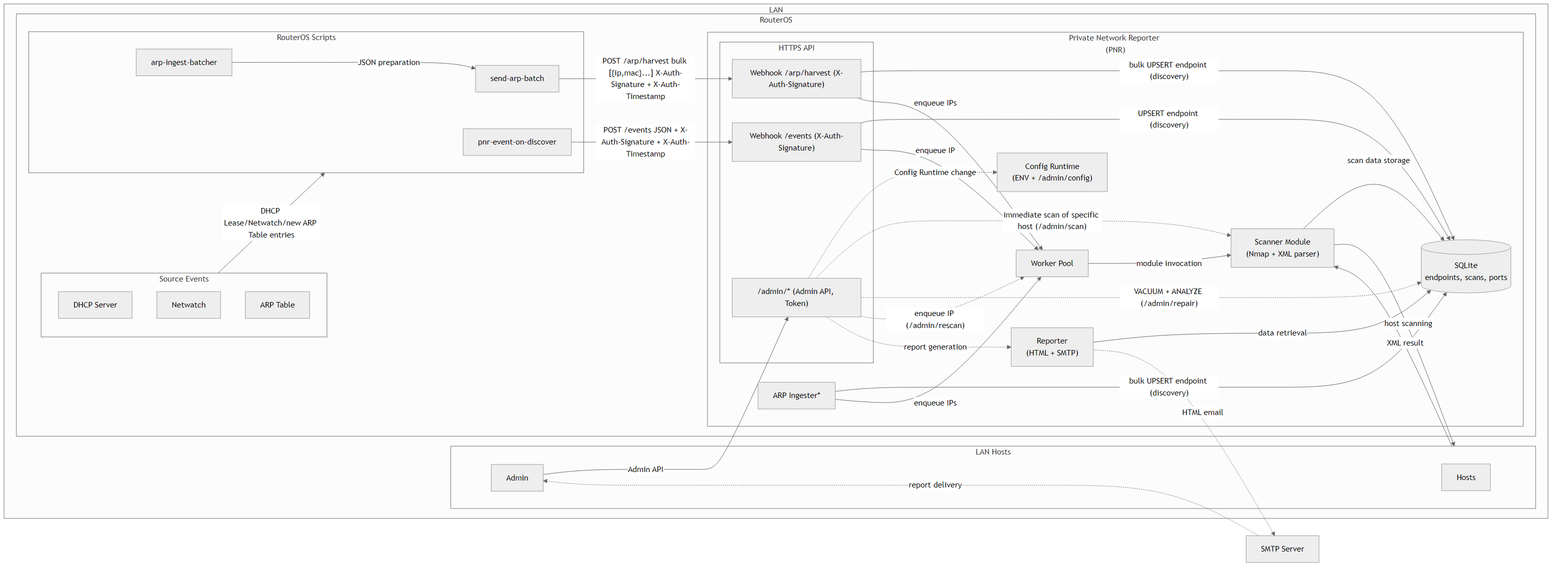 Home and small-office networks often lack visibility into what devices are connected and what services they expose. Enterprise-grade SIEM/NAC solutions are too complex and expensive for these environments. PNR fills that gap with a zero-dependency, self-contained monitoring system that plugs directly into MikroTik routers. The event-driven architecture processes DHCP lease and Netwatch webhooks from RouterOS, bulk ARP table pushes, and local /proc/net/arp monitoring (Linux container). All discovery events flow through a unified pipeline with MAC-based deduplication and cooldown protection before reaching the Nmap scanning workers.